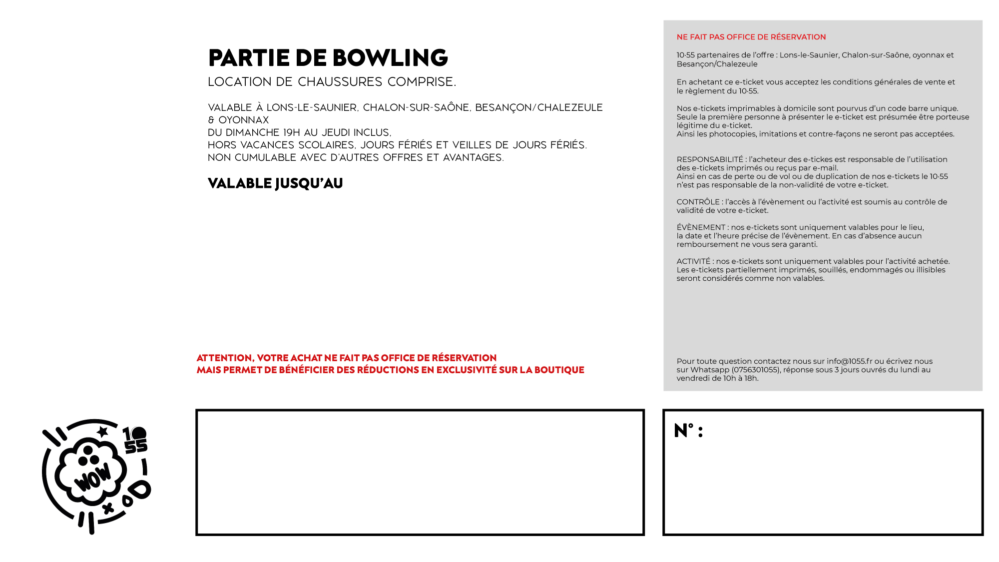 - Le pack de 5 parties de bowling est valable uniquement du dimanche 19h au jeudi inclus, hors vacances scolaires, jours fériés et veilles de jours fériés, non cumulable avec d’autres offres et avantages