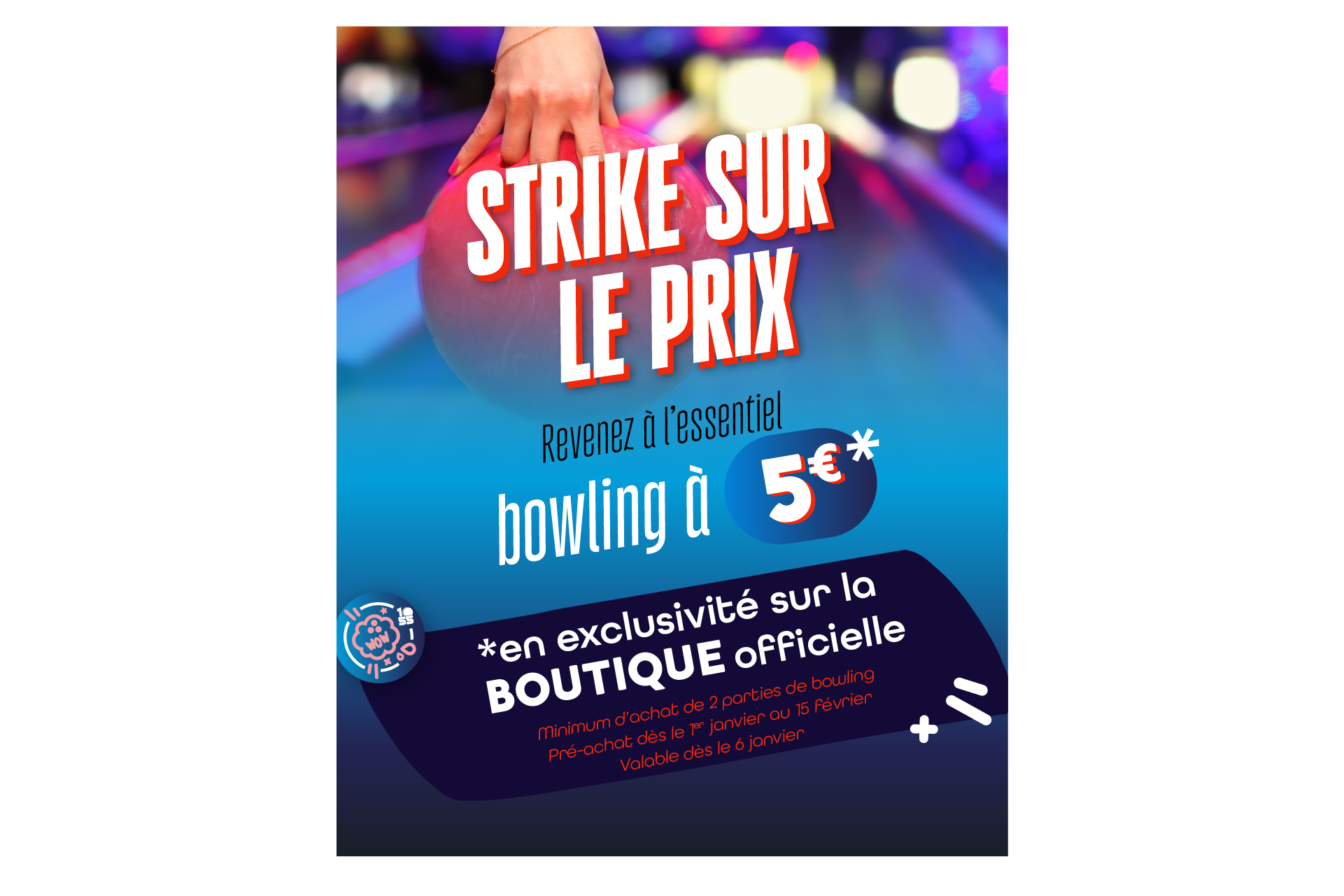 - 5€ la partie de bowling, soit 10€ les 2 parties (minimum d’achat 2 parties)
